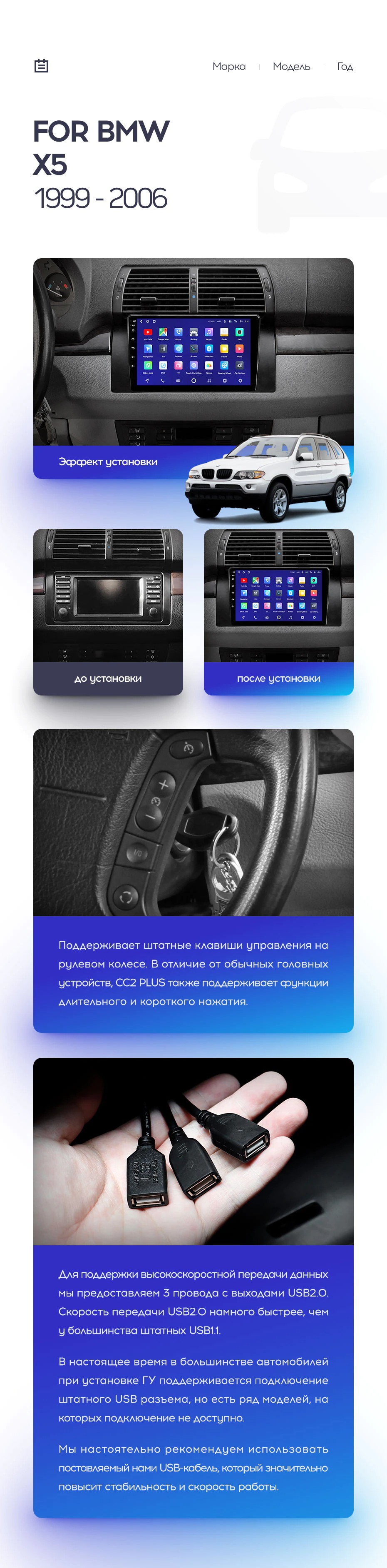 Полный комплект установки магнитолы Teyes с рамкой и проводкой можно выбрать в каталоге штатных магнитол BMW X5 E39 E53 (1999-2006).