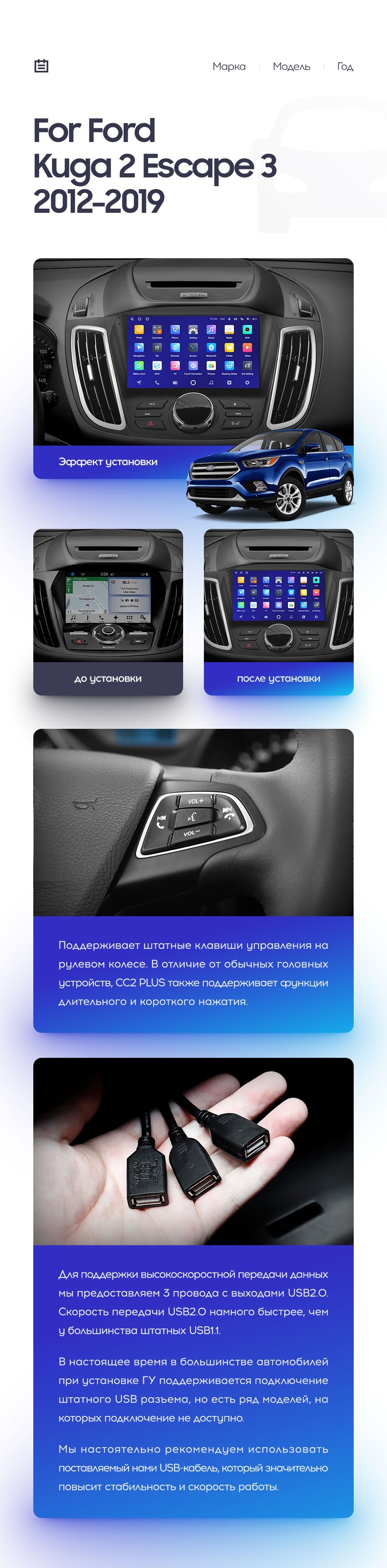 Полный комплект установки магнитолы Teyes с рамкой и проводкой можно выбрать в каталоге штатных магнитол Ford Kuga 2 (2012-2019).