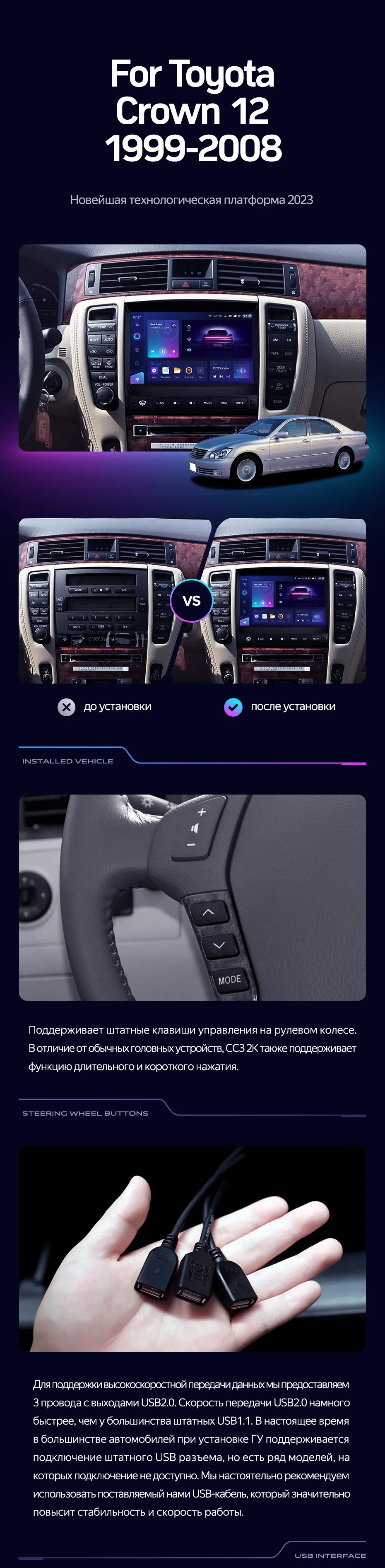 Полный комплект установки магнитолы Teyes с рамкой и проводкой можно выбрать в каталоге штатных магнитол Toyota Crown 12 S180 (1999-2008).
