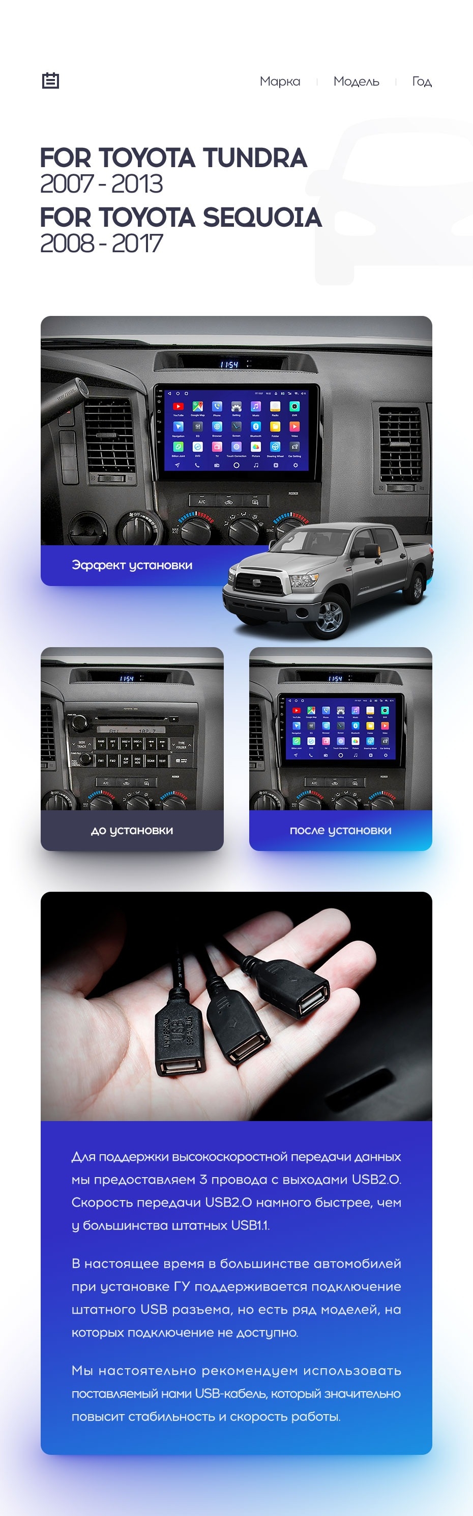 Полный комплект установки магнитолы Teyes с рамкой и проводкой можно выбрать в каталоге штатных магнитол Toyota Sequoia XK60 (2008-2017).