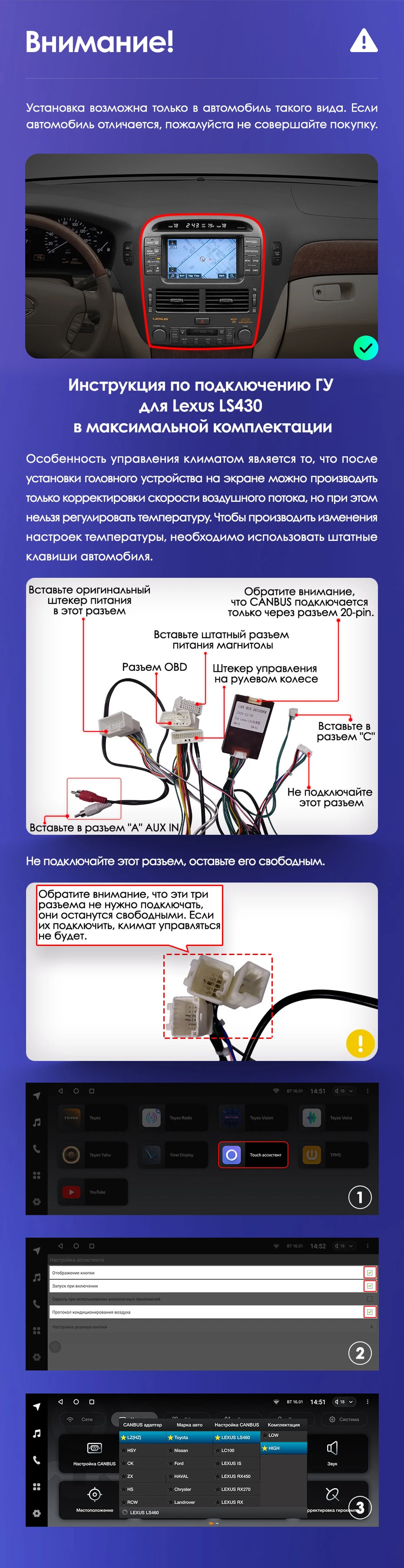Полный комплект установки магнитолы Teyes с рамкой и проводкой можно выбрать в каталоге штатных магнитол Lexus LS430 XF30 (2000-2006).