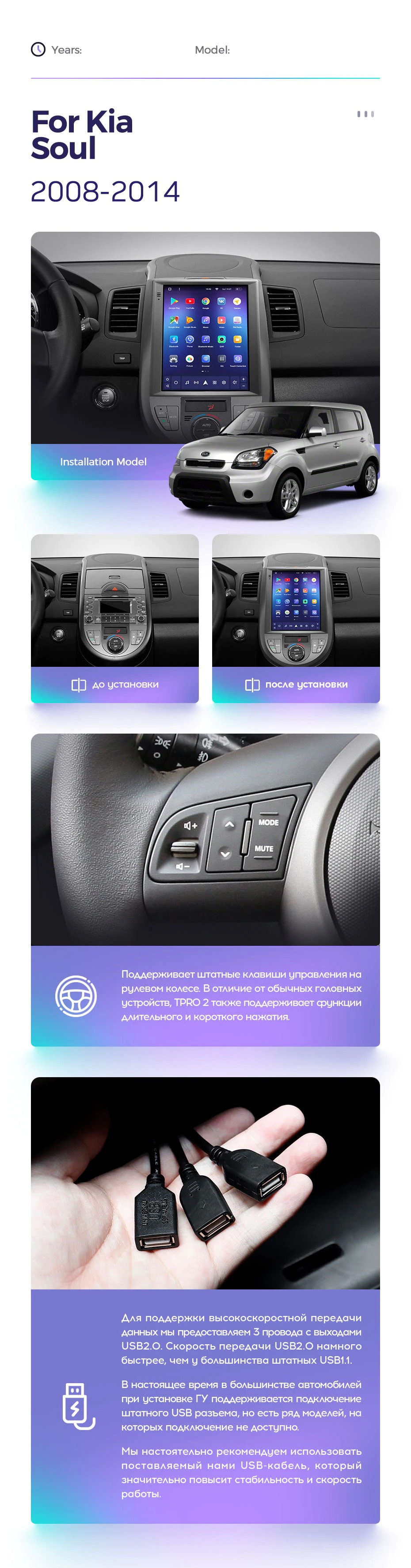 Полный комплект установки магнитолы Teyes с рамкой и проводкой можно выбрать в каталоге штатных магнитол Kia Soul 1 AM 2008-2014.